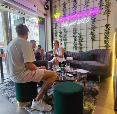 Cozy café-bar offering marijuana and derivatives to buy and smoke, with relaxing vibes, comfort, music, and friends.